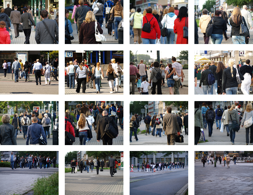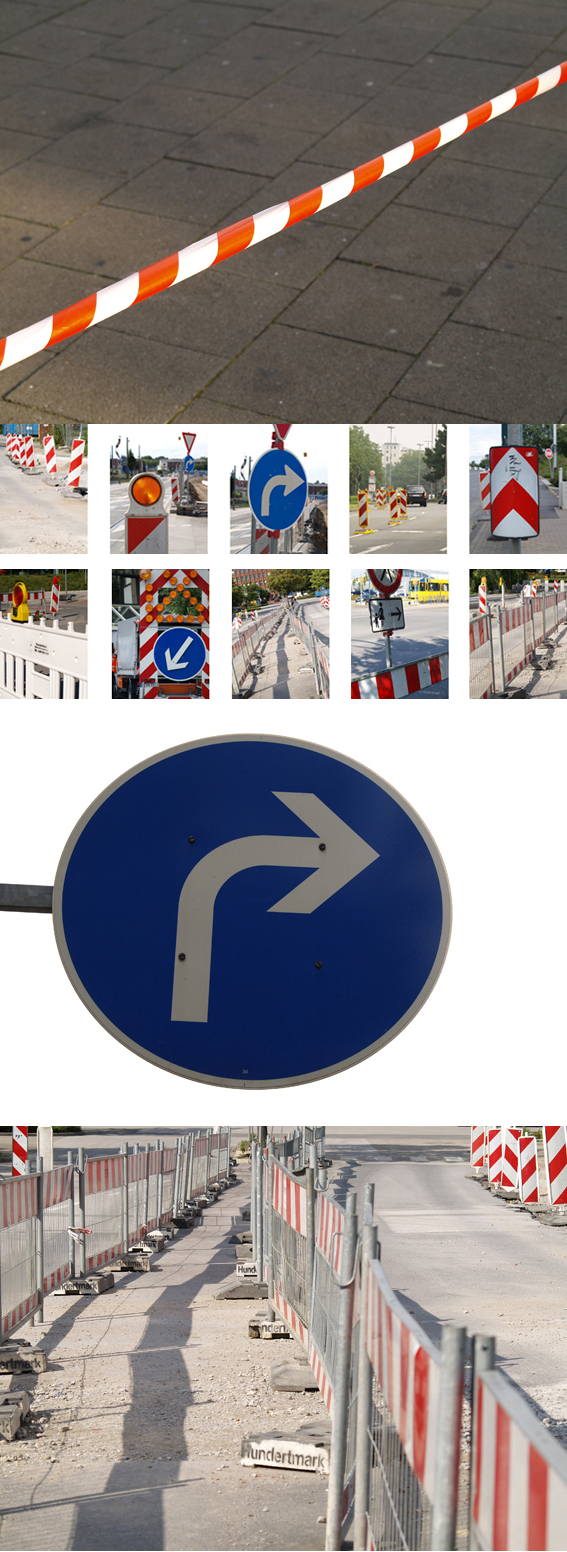 Red-and-white attention tapes redirecting the passers-by from their planned ‘tracks’ (sometimes individual people, sometimes bigger groups of pedestrians).