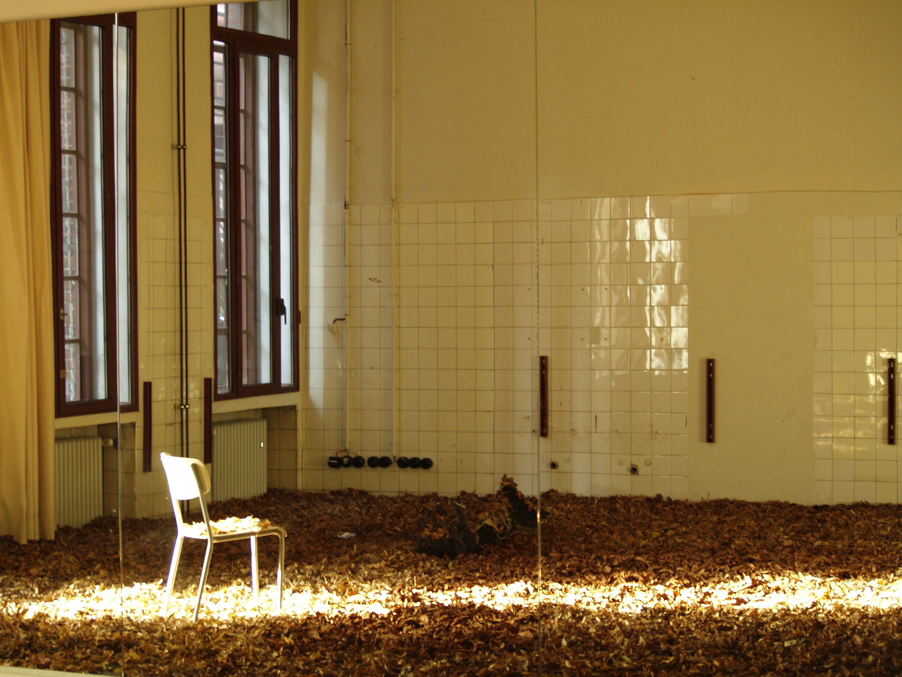 The second part of the project was a site-specific ambience-installation at P.A.C.T. Zollverein: Studio is out of use, refers to the found condition of a former coal mine industrial complex where the residence takes place, offering an artistic studio. The author brings outdoor elements into the indoor space, merging their conditions into one whole; a notion of time standing still, or the place standing still whilst the time passes-by, depicts the realistic state of the complex, which is nevertheless trying to find a new identification through art and culture.