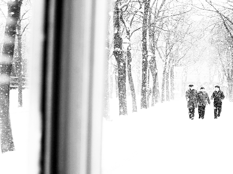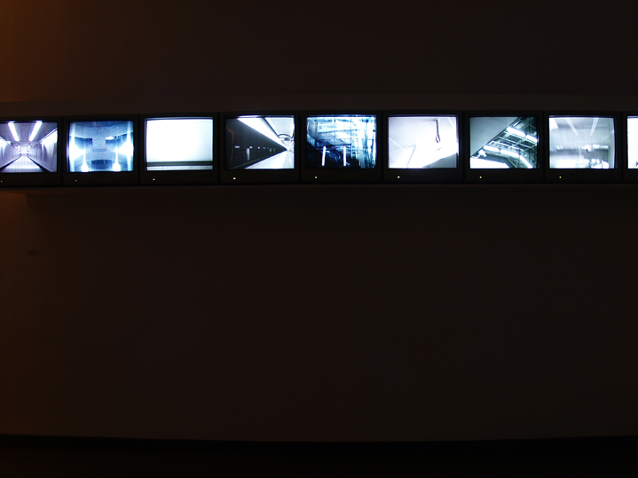 In regard to my artistic methodology, I appropriated the logic of the underground surveillance system, operatively and aesthetically. I recorded a multitude of video shots, but instead of surveilling people, I turned the view against the space. Shown are recordings cleaned from human presence, revealing thus more about the characteristics of space itself and the accentuating presence of the “surveilling eye” which has its impact on patterns of our behaviour in public (non)places as well. In a gallery setup, those sequences were shown on numerous subway-monitors on one wall, while photographs depicted the above-ground spaces between the subway stations, covered with snow and photographically overexposed (alluding to the disappearance of the traditional place) on an opposite wall.