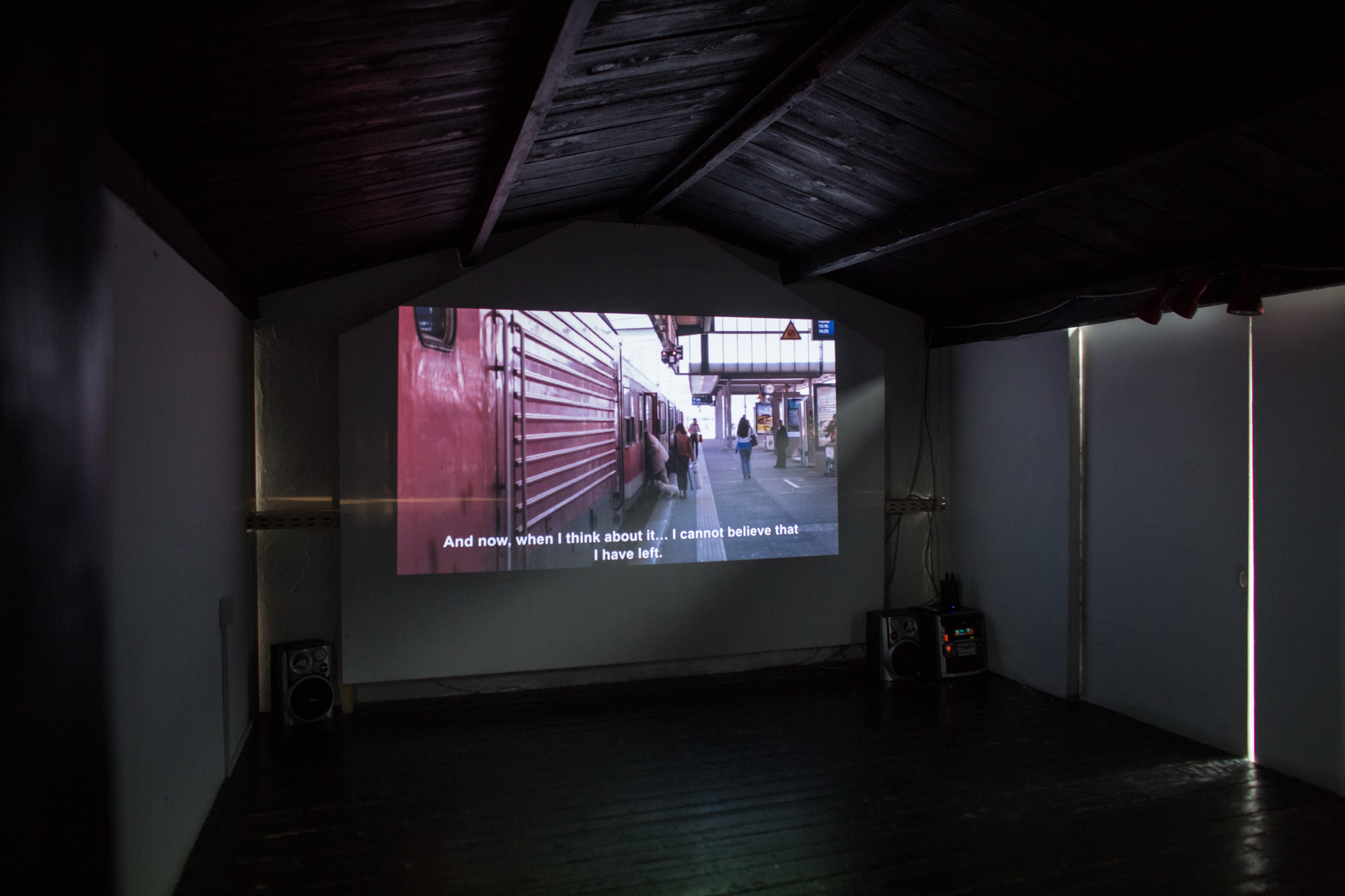 The exhibition Spaces Between (Living) Places at the Student Centre Gallery was showcased as a media installation composed of three segments: a multi-channel sound installation presenting discussions with numerous individuals, economic migrants from the region, a video projection of discussions with the artist and reading of the “Bewerbung“, the official application form used for finding employment in Germany as a tool for creating a new identity, and a selection of clips from the artist’s relocated everyday life.