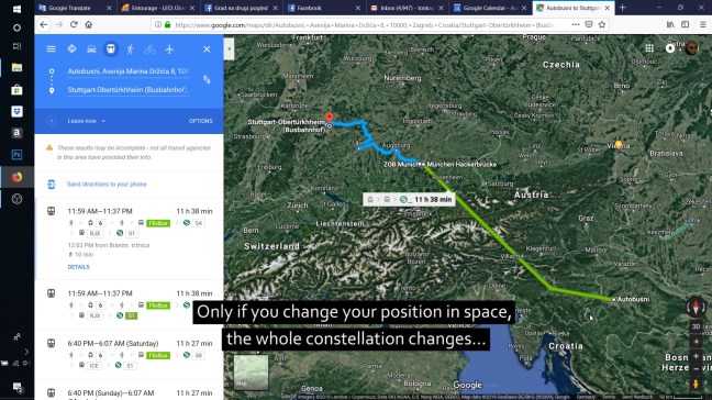 In the video named “Body in Space”, I reconstructed my personal experience of this one year migration period. By using Google maps and other open-source tools, I compressed it dynamically into a 13-minutes story. The narration, inspired by my own and other people’s experiences, voice-overs a video in 3 languages (Croatian, German, English). The video reveals the patterns of movements and inspects deeper into reasons, expectations, hopes and visions that drive the shifts of people within geographical and socio-economical coordinates.