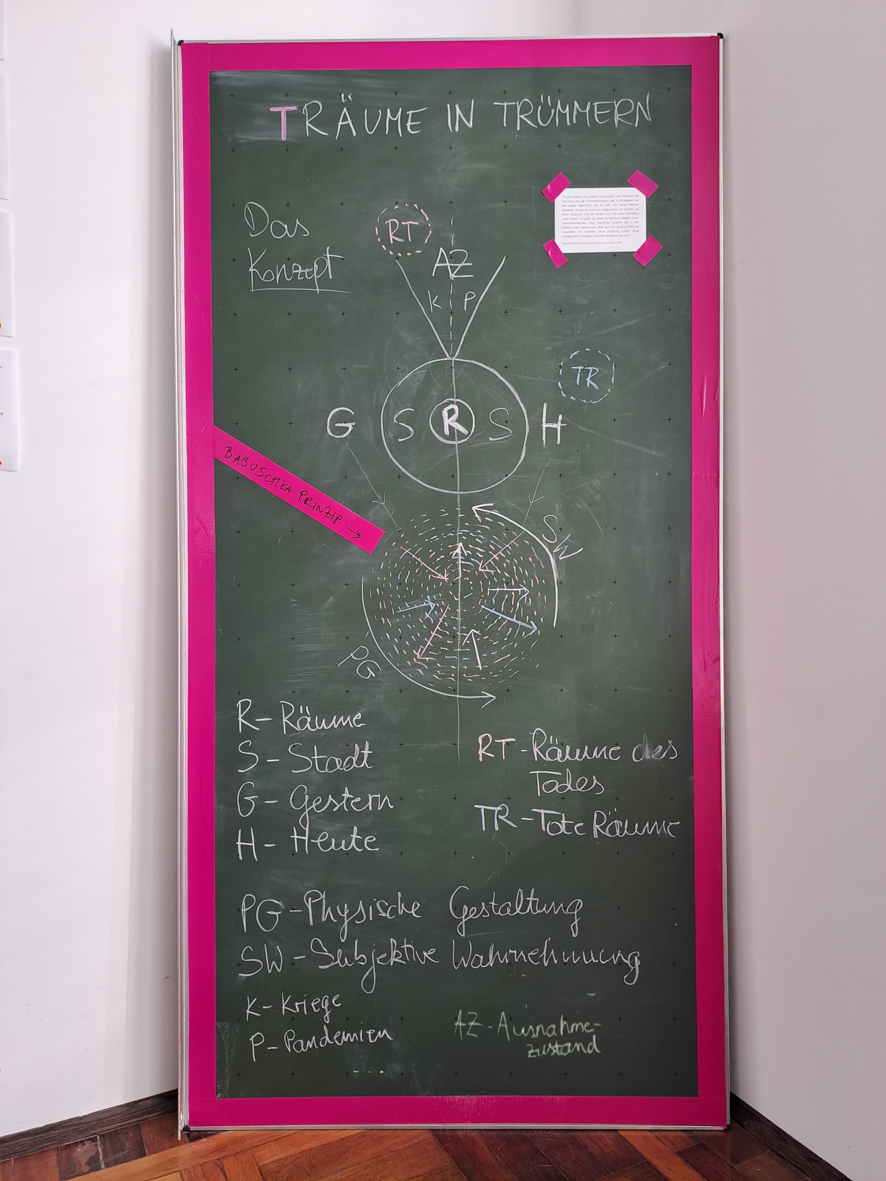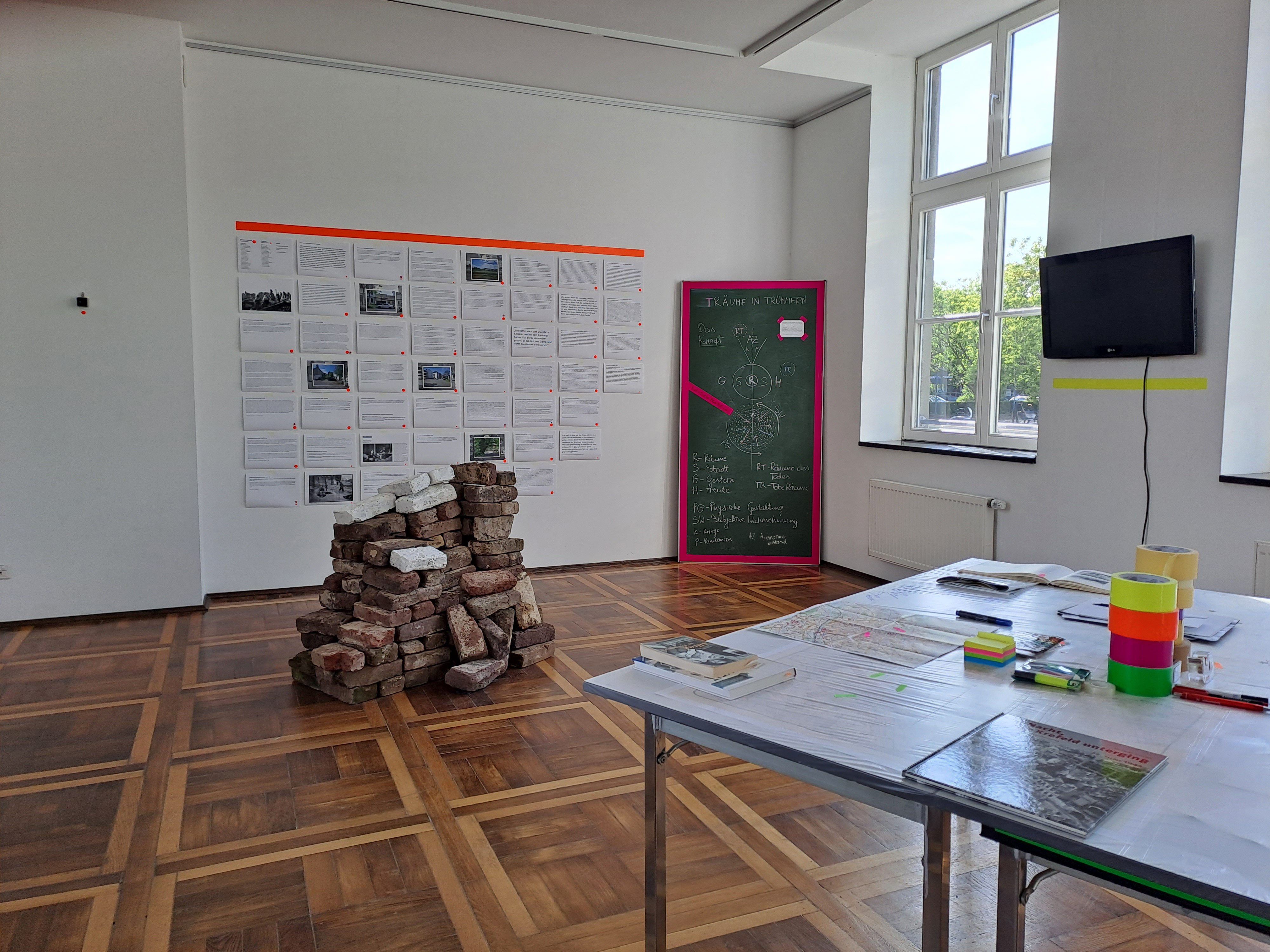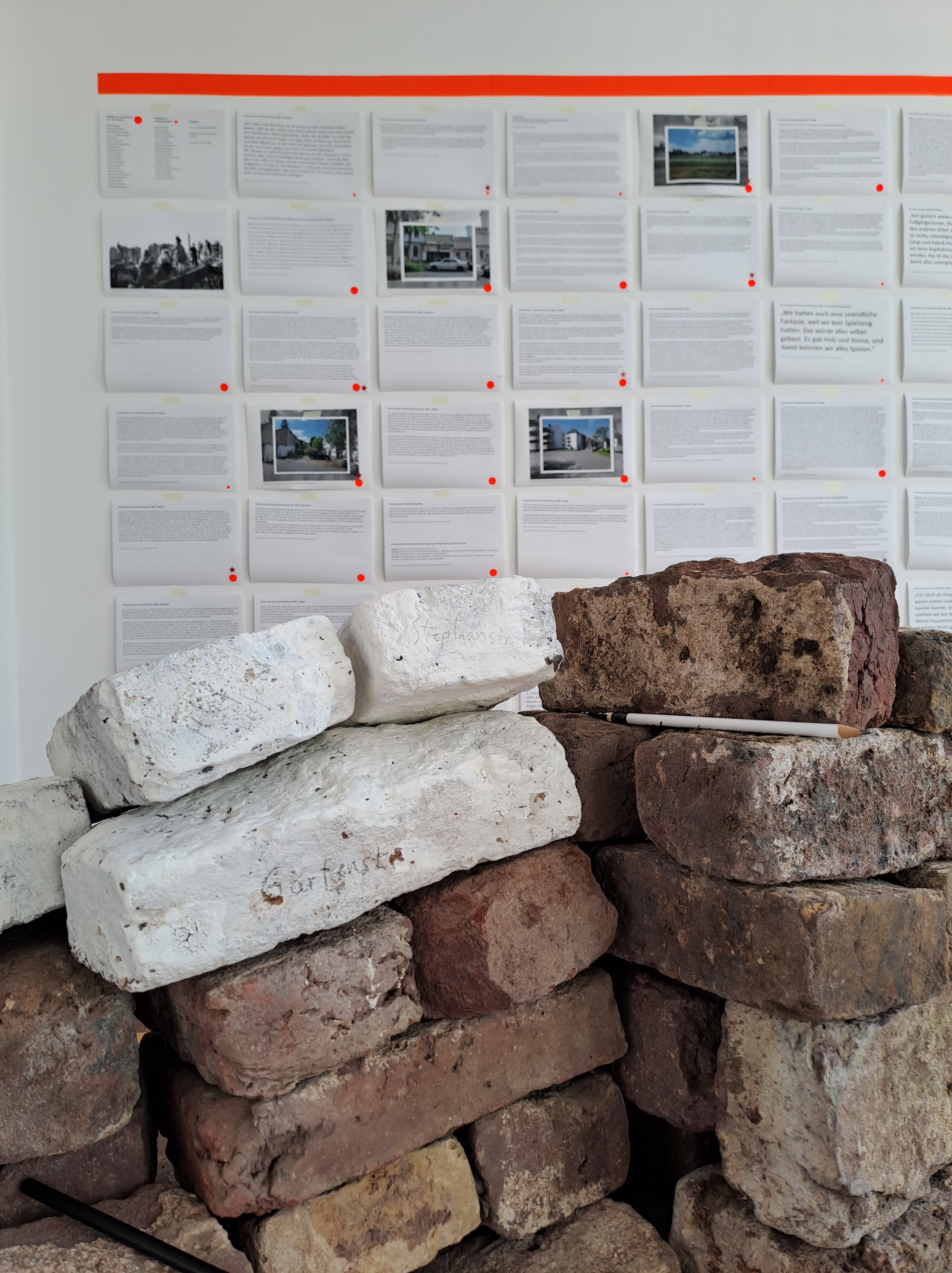 From April 29 to June 10, 2023, interested citizens had the opportunity to participate in work in progress at the gallery and share their memories and insights. The installation accompanying the project functioned both as a means of collecting memories and as a representation of the city’s palimpsest. The goal was to find out how children appropriated the city during the difficult after-war time and how they converted the landscape of ruins into a playground. “The ambivalent feeling of freedom in a dangerous and insecure environment starkly contrasts our current view of the city. Today’s city is less open and accessible than in the post-war period as a thoroughly regulated, thoroughly functionalized, and heavily monitored space, where the private interests of smaller privileged groups determine the quality of life of the majority” (Emmanuel Mir).