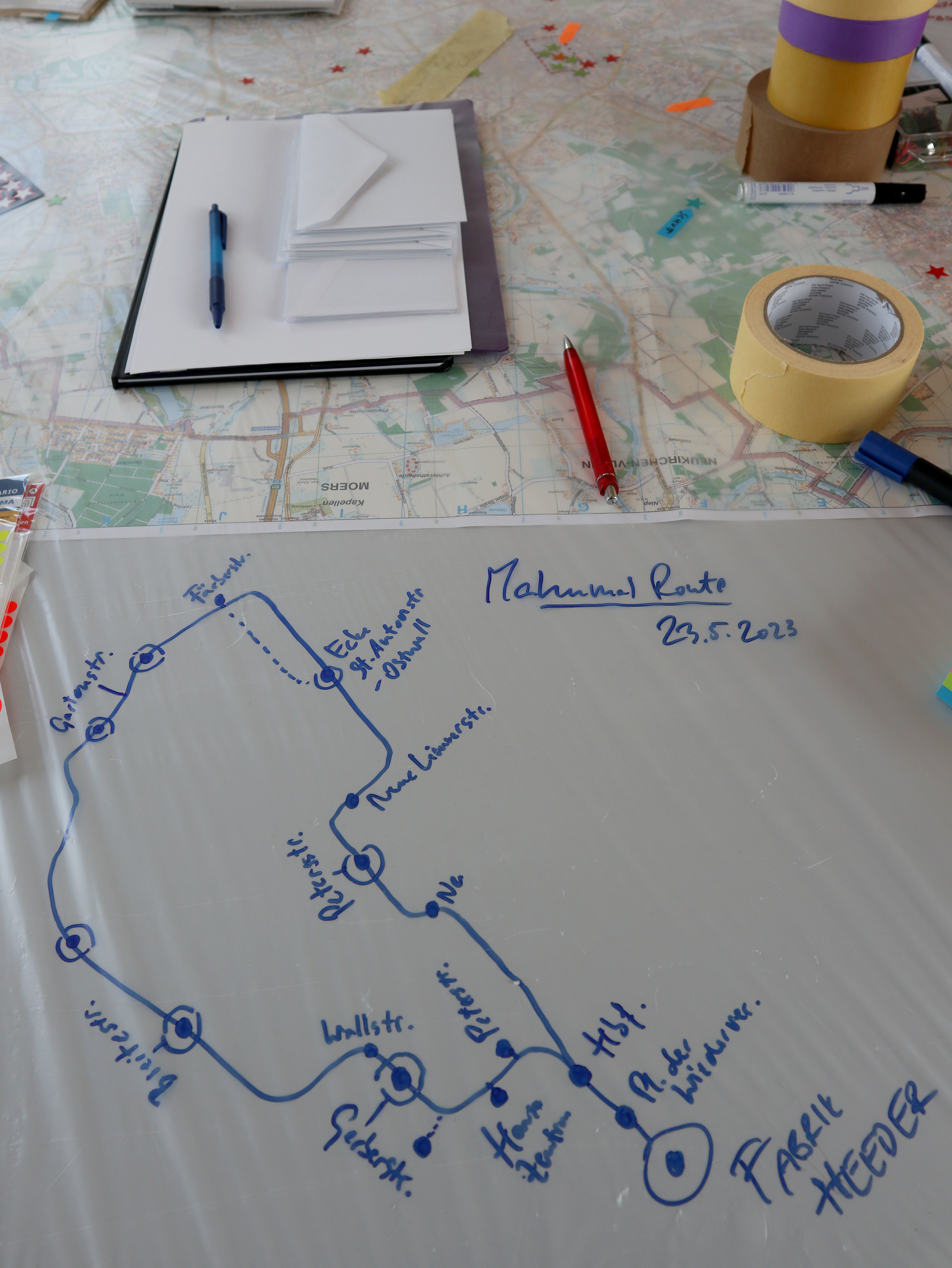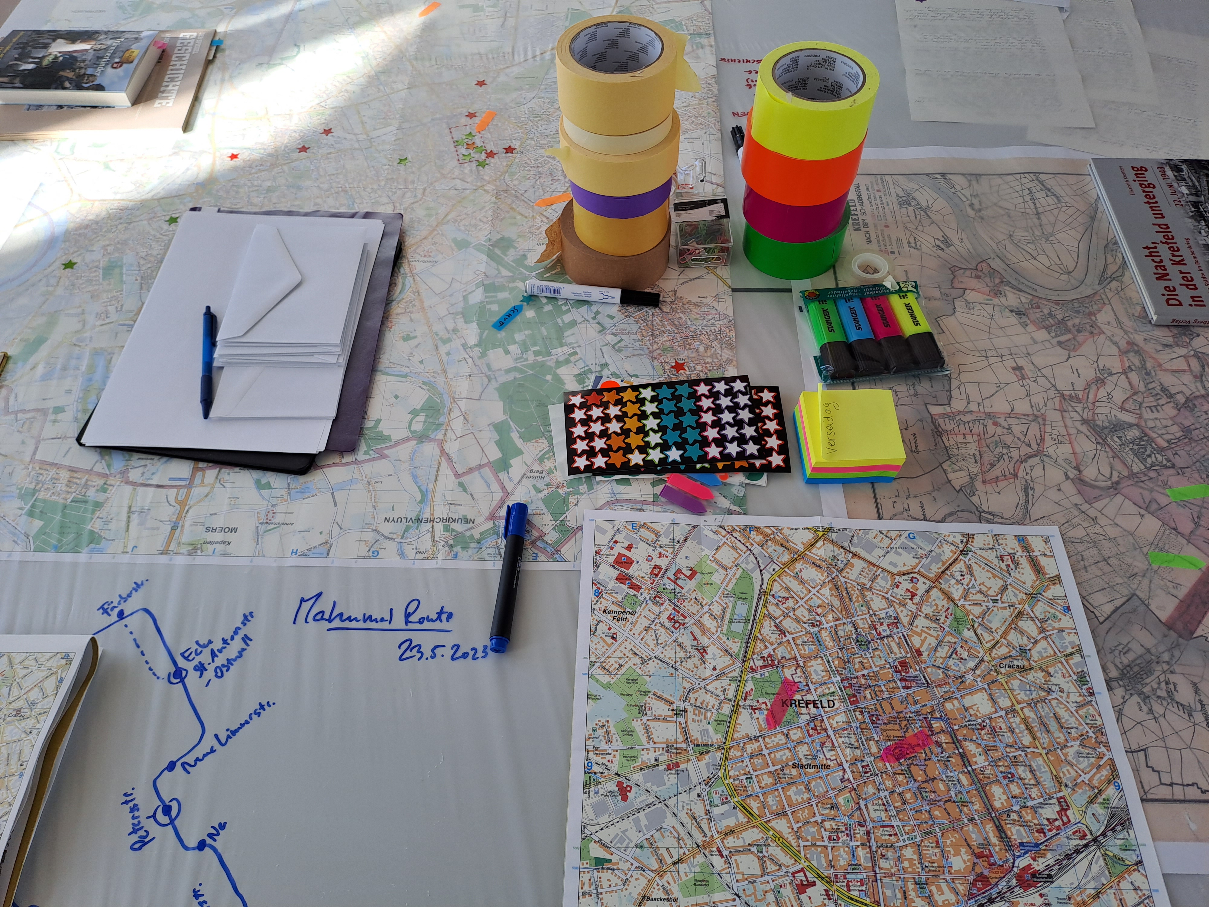 For the process-oriented art gallery Pförtnerloge in Krefeld, I developed a “memorial for dead spaces” (“Mahnmal für tote Räume“) which connected two points in time; the post-WWII city and the city of today. Collected stories, memories, associations, experiences, observations, maps, and photographs question the relationship between “spaces of death” and “dead spaces” at the same geographic coordinates over the past 80 years. The project examines the phenomenology of physical and imaginative space and their intersections through aspects of the body, play, and interaction in public space.