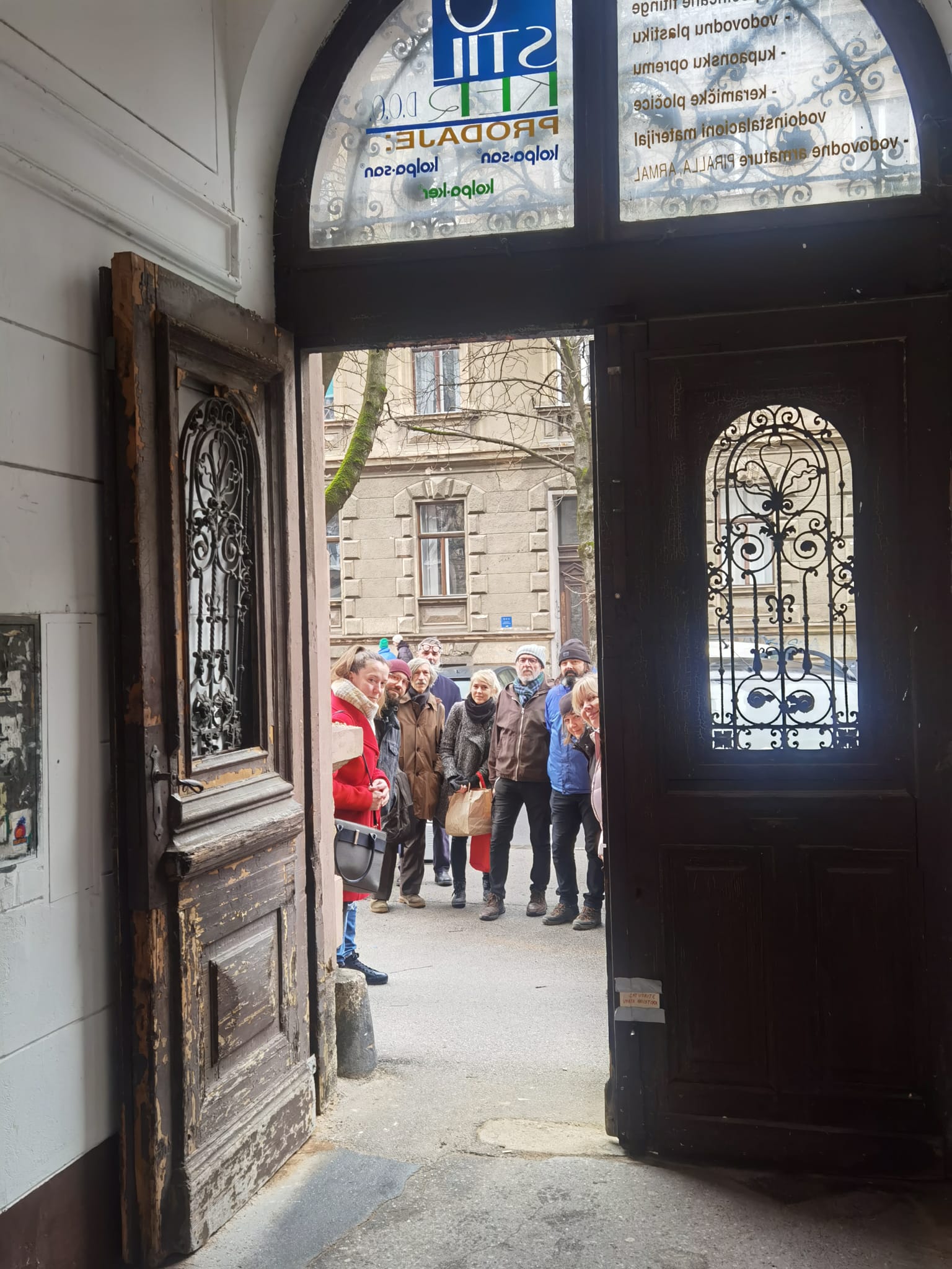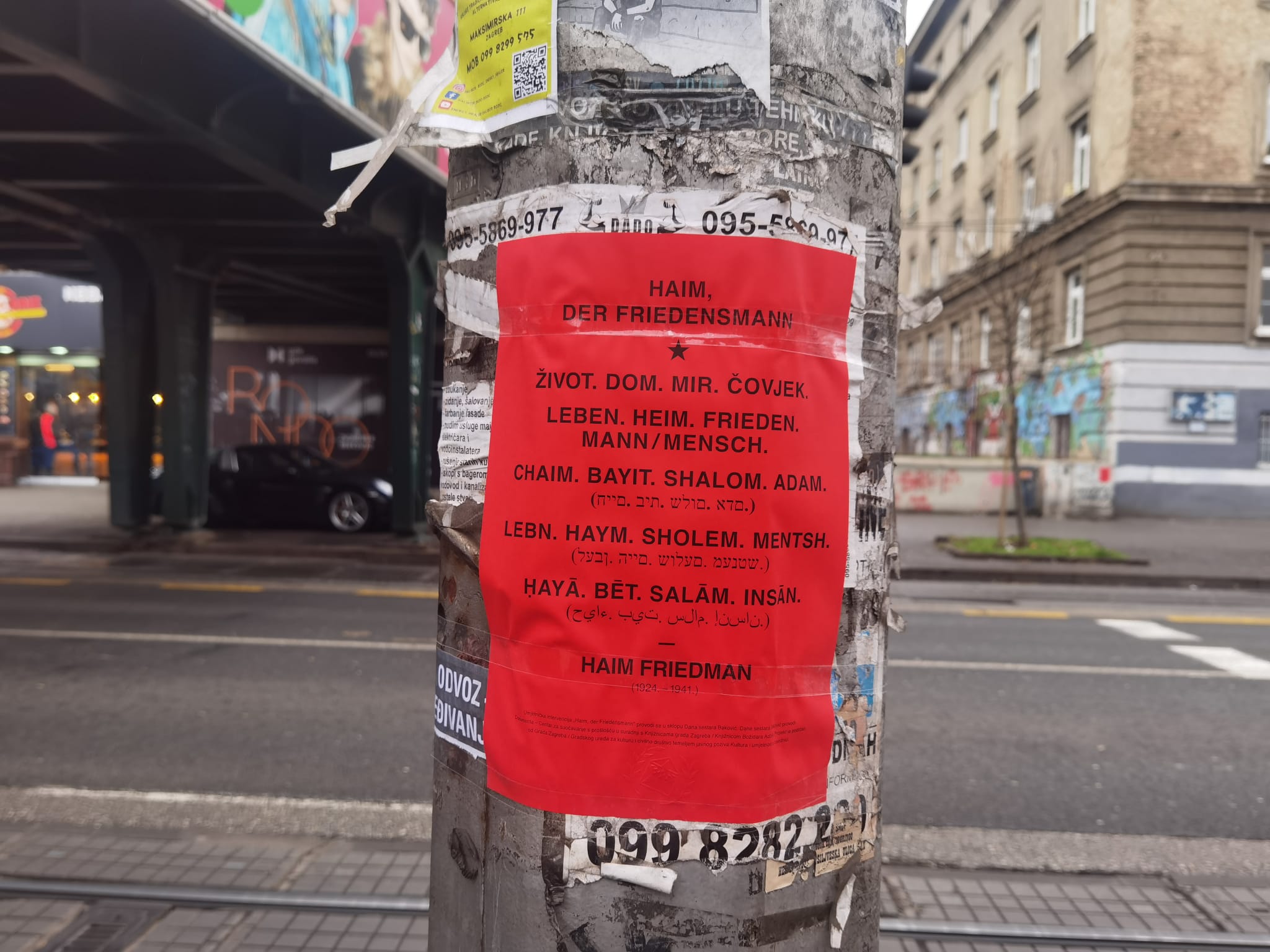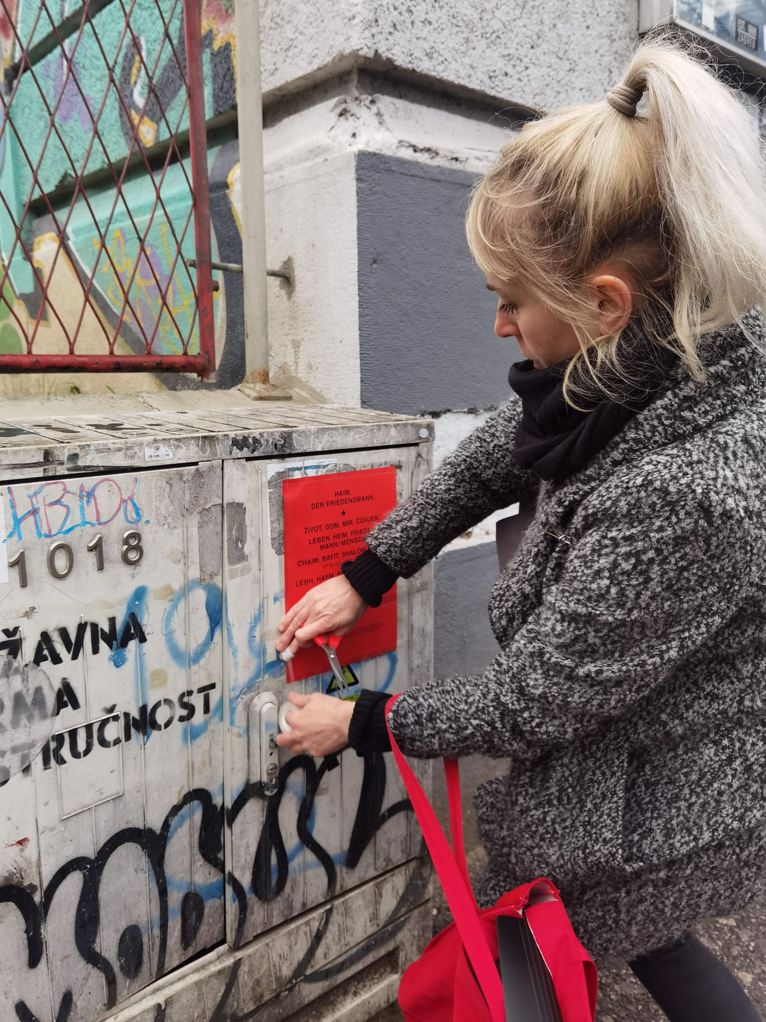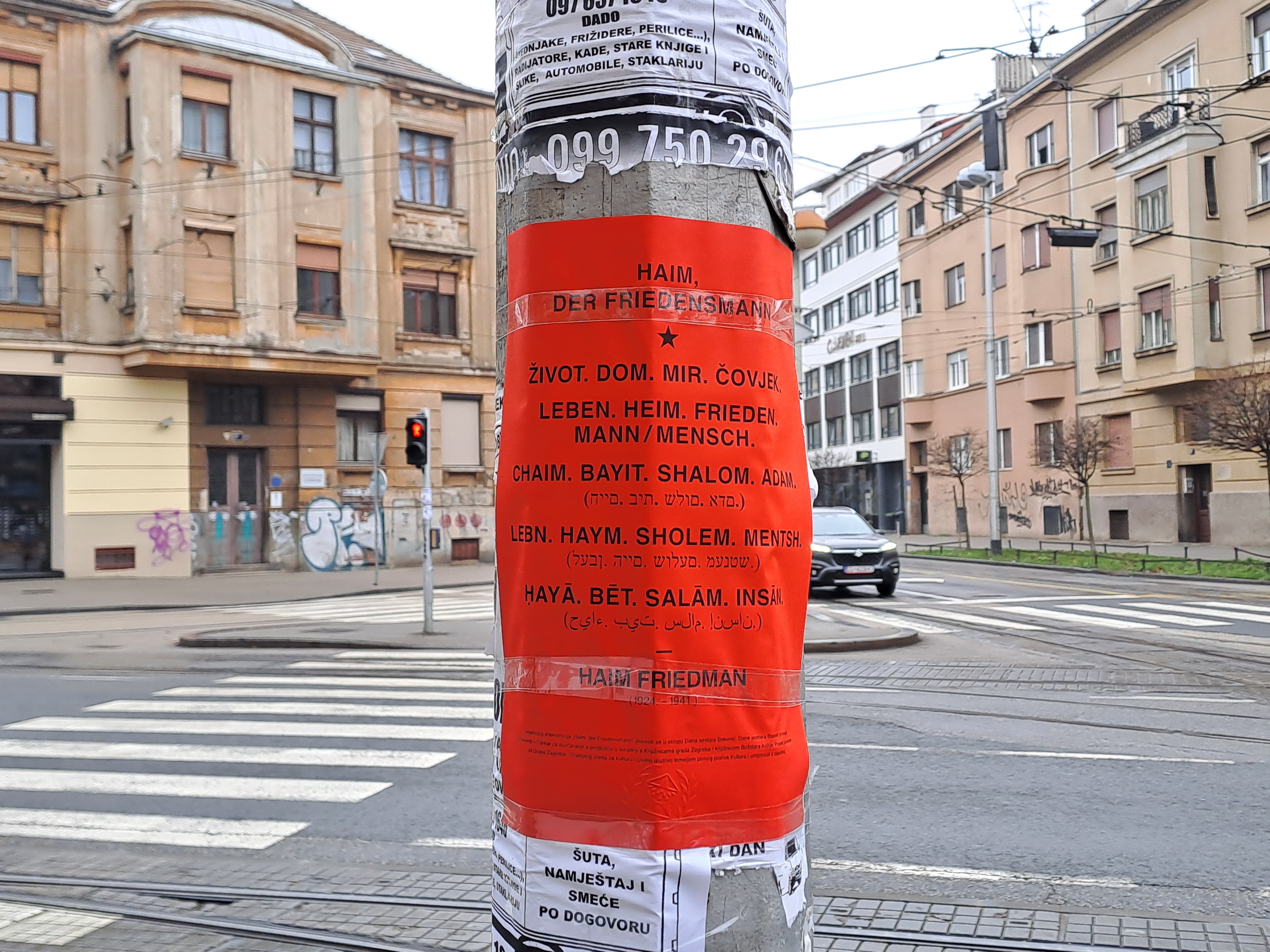 The flyers were installed over a one-month period along Savska Street, between the location of the former paper wholesale store on Deželićeva Street and the intersection of Savska and Vukovarska Streets. The project concluded with a performative walk originating from the building courtyard on Deželićeva Street, during which visitors became active participants by distributing red scrolls titled Haim, der Friedensmann to passers-by.