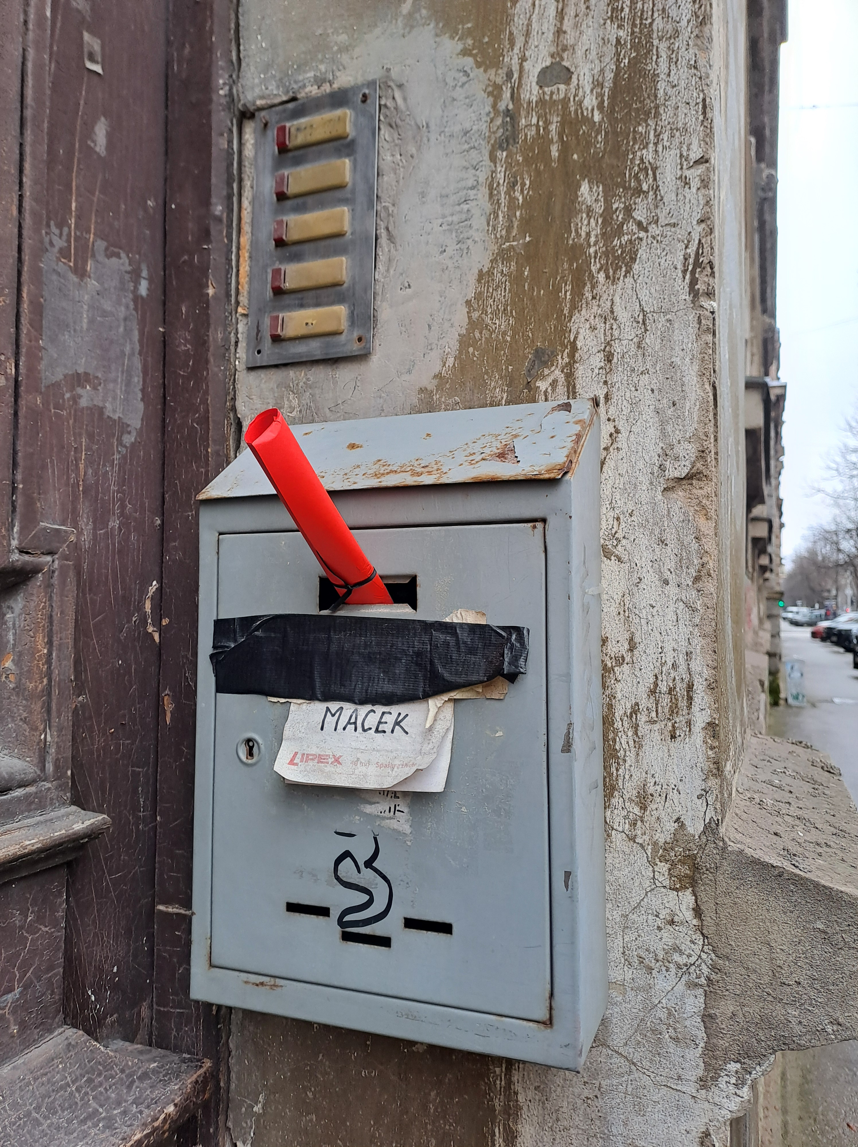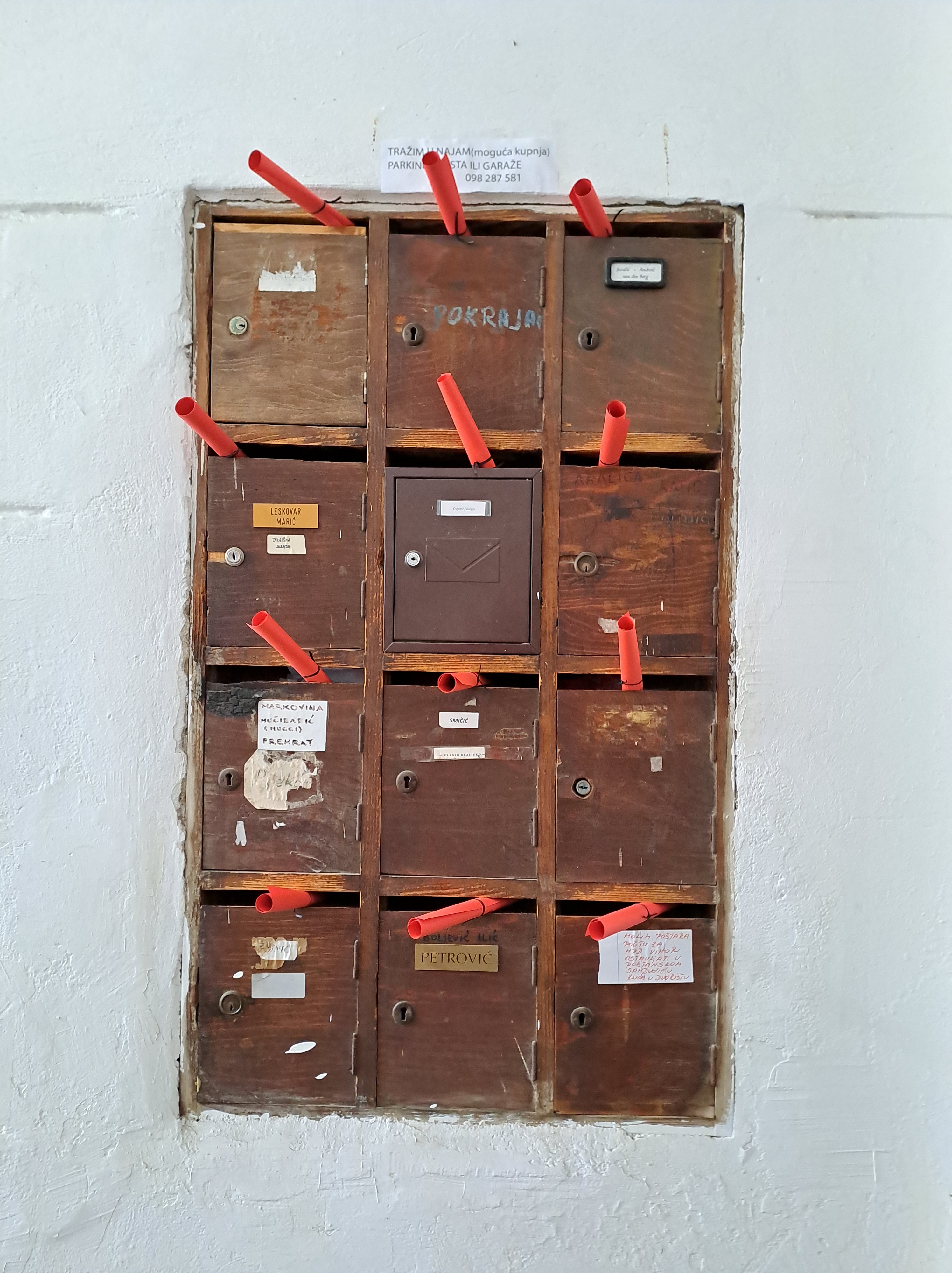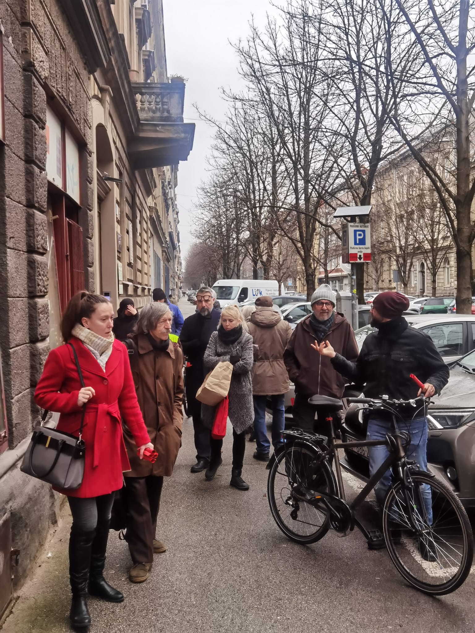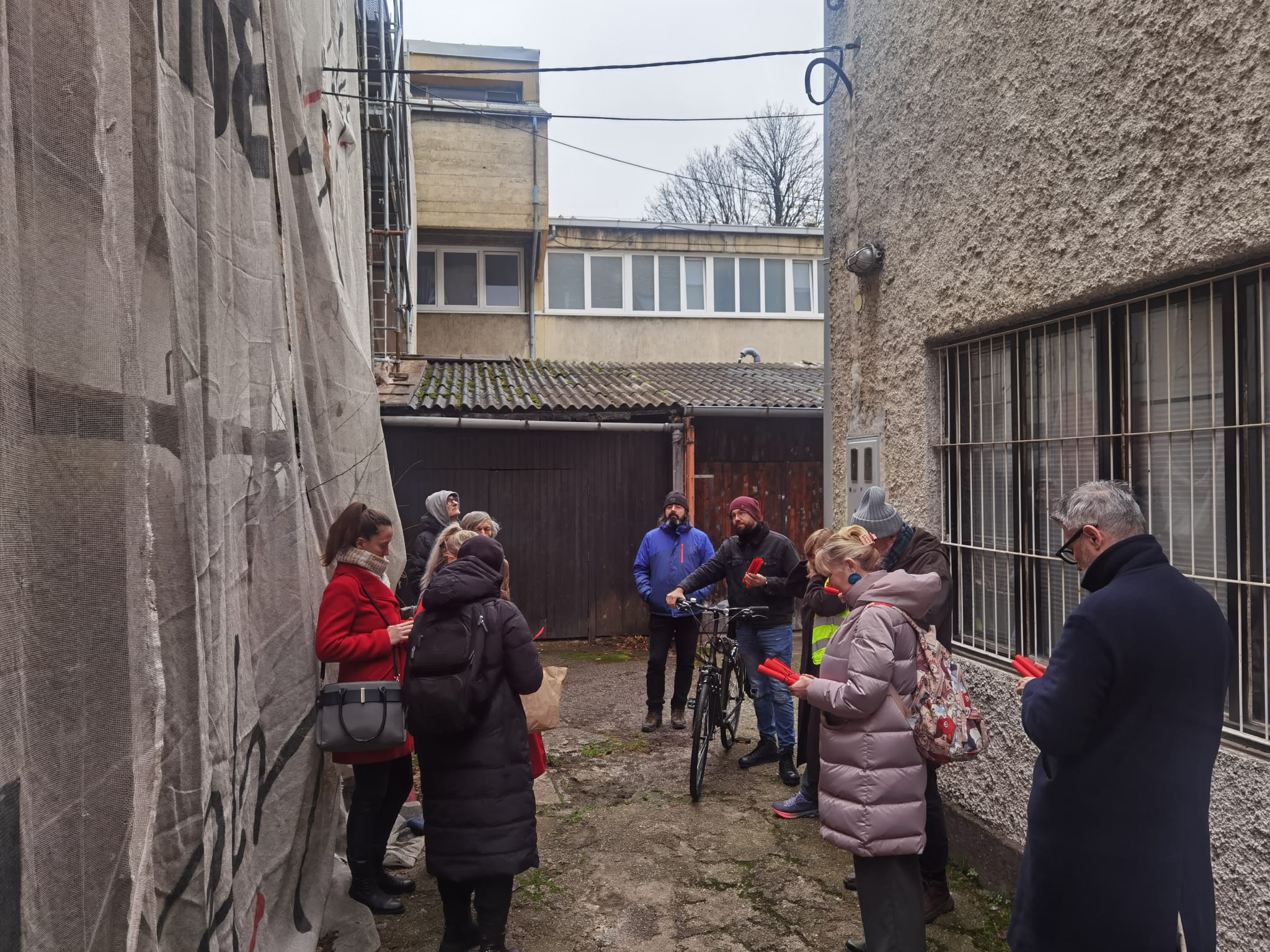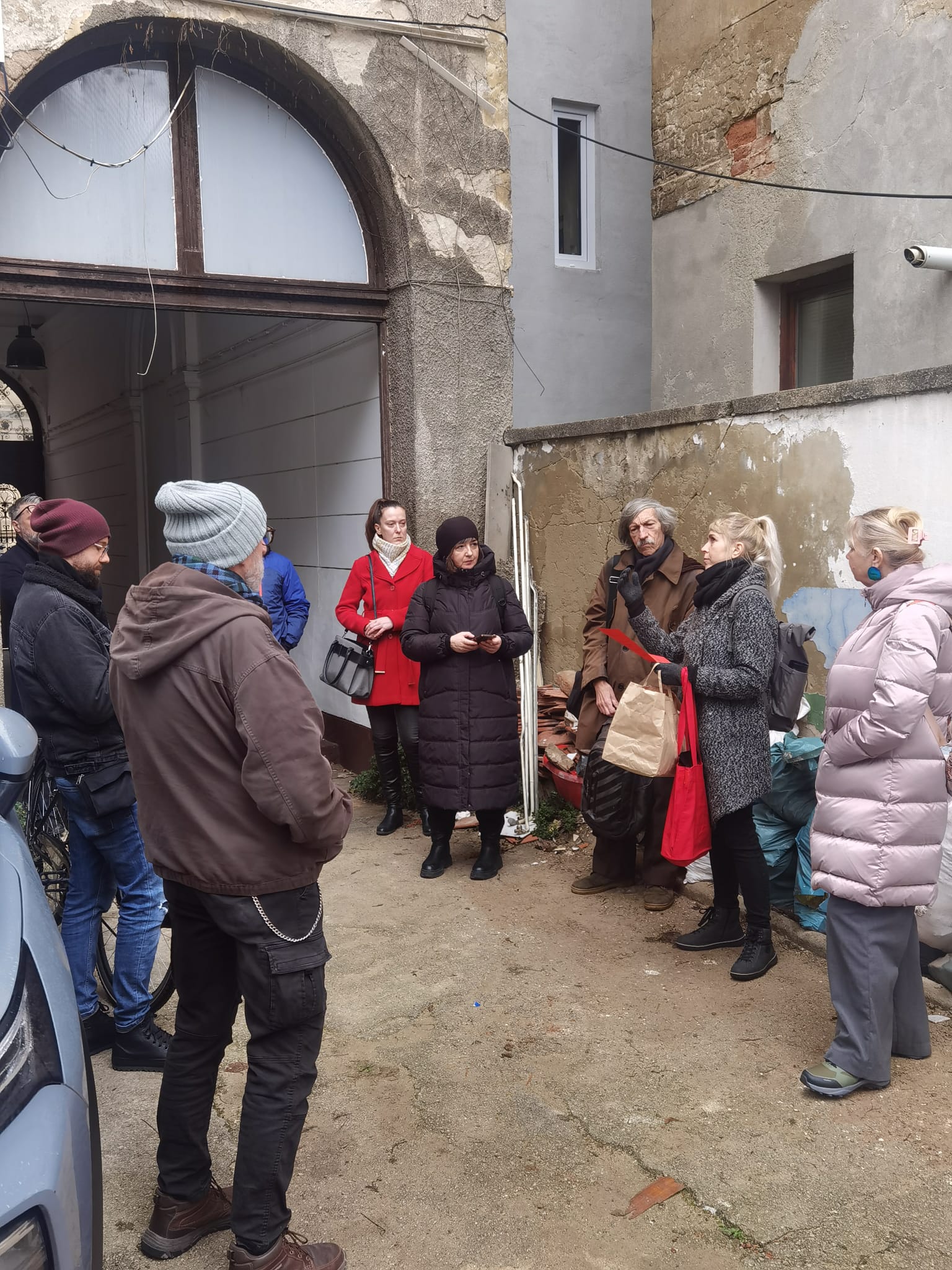 The flyers were installed over a one-month period along Savska Street, between the location of the former paper wholesale store on Deželićeva Street and the intersection of Savska and Vukovarska Streets. The project concluded with a performative walk originating from the building courtyard on Deželićeva Street, during which visitors became active participants by distributing red scrolls titled Haim, der Friedensmann to passers-by.